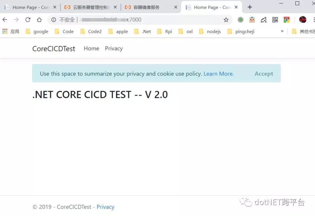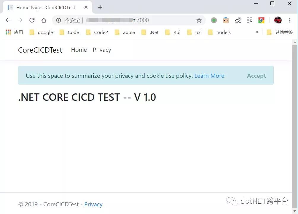 运行一下看看效果,网站正常显示 .NET CORE CICD TEST -- V 1.0