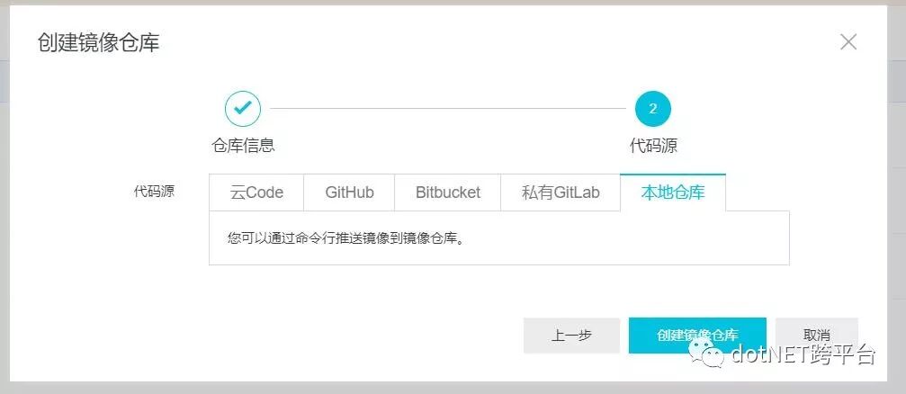 点击下一步,代码源选择“本地仓库”,点击“创建镜像仓库”完成仓库的创建