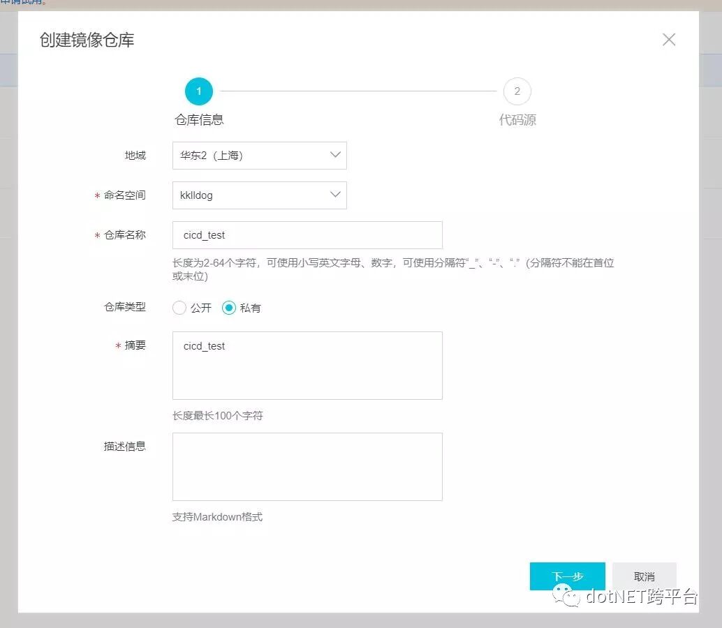 点击“创建镜像仓库”按钮,弹出创建界面。填写命名空间kklldog,仓库名称cicd_test